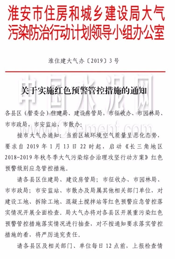 同日,淮安市淮住建大氣辦發(fā)布《關(guān)于實施紅色預(yù)警管控措施的通知》,通知稱:當(dāng)前區(qū)域環(huán)境空氣質(zhì)量呈惡化姿態(tài),要求自2019年1月13日22時起,啟動《長三角地區(qū)2018-2019年秋冬季大氣污染綜合治理攻堅行動方案》紅色預(yù)警級別應(yīng)急管控措施。