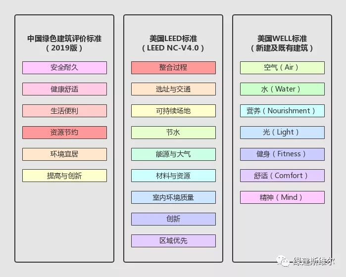 中國綠色建筑評價標(biāo)準(zhǔn)與美國LEED標(biāo)準(zhǔn)類似,主要關(guān)注建筑本身的性能,比如節(jié)地、節(jié)水、節(jié)能、節(jié)材以及環(huán)境保護等(“四節(jié)一環(huán)保”),并且都是按照申報項目獲得的分?jǐn)?shù)來劃定綠色建筑評價等級,不同的是中國綠色建筑星級認(rèn)證有效期為2~3年,美國LEED認(rèn)證終身有效。美國WELL標(biāo)準(zhǔn)則側(cè)重探索建筑與其居住者的健康和福祉之間的關(guān)系,按照符合的條款數(shù)量劃分綠色建筑評價等級,WEEL認(rèn)證有效期為3年。